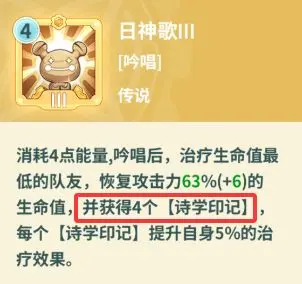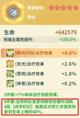 希望琥珀的四件套效果,可用4层诗学印记为队友免死。满觉醒的日神歌,一个技能就是4层,开局放一个,再上其他辅助buff。若队伍输出强,但骑士活不到丢buff,奶妈甚至可再带个天象,连续保队友命。