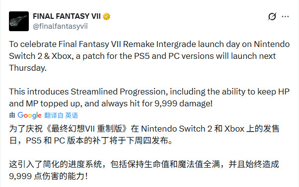 Square Enix宣布,现有的PS5和PC版最终幻想7重制版Intergrade将于1月22日收到免费更新,同样加入简化进度功能。这一时间与Switch 2、Xbox Series X/S版本游戏的发售时间同步。