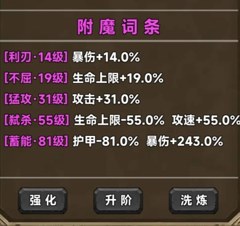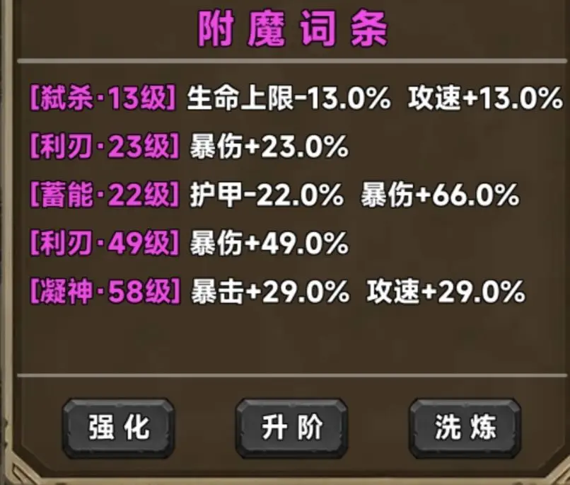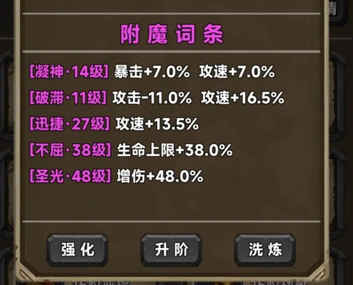 如果角色还没满暴击,那么加暴击率的词条优先级排在T0与T0.5之间,重要性仅次于圣光,因为满暴击是发挥其他词条效果的基础。在同级别词条中,减攻击增攻速的词条比单攻速或者减生命上限增攻速的优先。生命上限和攻击可以靠百分比藏品提升,所以词条作用相对不大。另外,关于穿透与护甲属性,个人更偏向护甲,在当前版本护甲的作用相对更大一些。