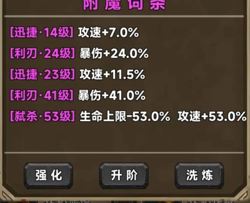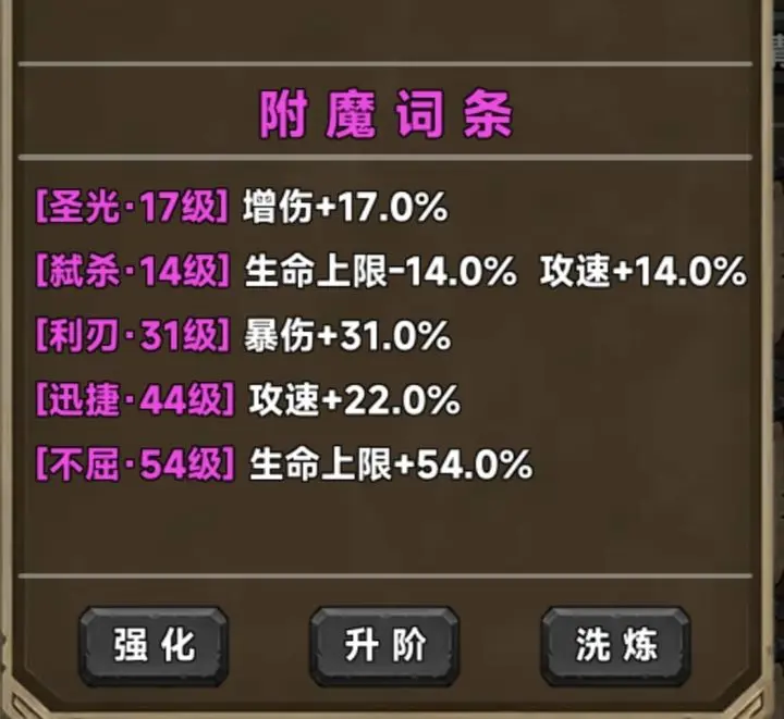 T0的圣光词条增伤效果显著,能大幅提升角色输出能力,是满暴击后必选词条。T0.5的蓄能减护甲可让角色对敌人造成更多伤害,增爆伤进一步强化输出;破滞减攻击能降低敌人威胁,增攻速让角色攻击更频繁。T1的弑杀减生命加攻速,适合快速消耗敌人;迅捷单加攻速,提升攻击频率;凝神增暴击和攻速,攻速与同等级迅捷相同;不屈单加生命上限,增强角色生存能力;利刃单爆伤,提升暴击伤害;暗影加暴击和爆伤,爆伤与同级别利刃相同。