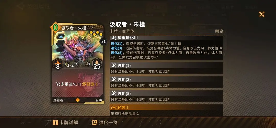 基本思路是多招进化召唤物,叠加召唤物攻击,增加进化召唤物出手次数。主要打法是先弄一个非进化召唤物或带减费的0费召唤物,没有就用技能招爬虫,再招其他进化召唤物,不够时用思维兽从牌库拉进化召唤物,使基因到5。接着招专属卡汲取者,她进攻距离为2且有进化,随回合成长,对持久战很重要。此时要注意召唤位,最好带孵化场。最后招浮翼领航者,他能让所有召唤物攻击次数加1,升满级后加2,让一群召唤物围攻敌人。