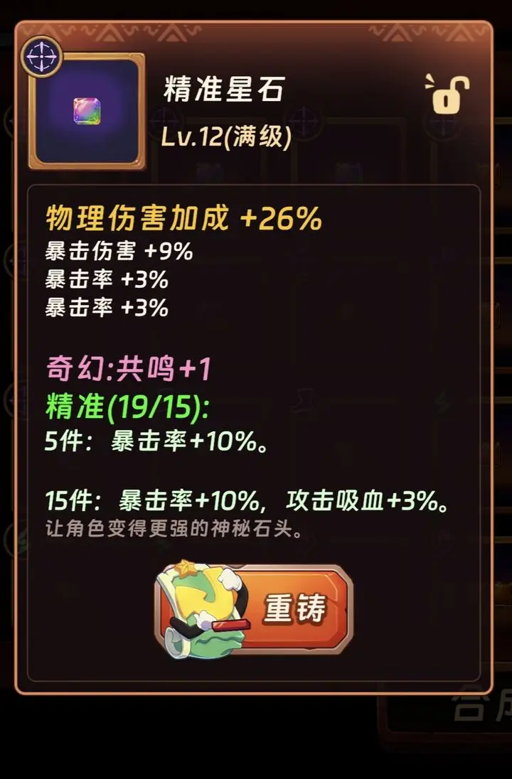 彩色和橙色星石在属性上没有差别,但彩色星石一颗算俩共鸣,两颗彩加一颗普通就能激活小共鸣词条。理论上全彩可激活3条大共鸣(15 + 15 + 15)和一条小共鸣(5),不过实现难度较大。