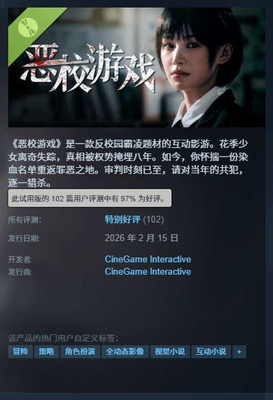 校园霸凌一直是备受关注的社会问题,而将这一题材融入游戏之中会碰撞出怎样的火花呢?最近一款国产互动影游给出了答案,它在Steam上线后收获诸多好评,究竟这款游戏有何特别之处,让我们一探究竟。
