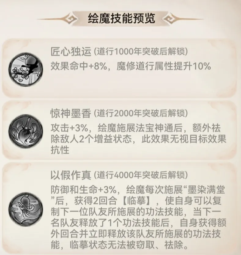 仙画行动时复制敌方增益,行动结束复制自身增益给队友;仙笔依增益数量增抗暴,祛除减益或增法宝蓄力,适合墨锦练度不高的情况。魔画释放法宝神通后无视抵抗祛除增益,施展职业主动技能获临摹状态;职业装备在减益被抵抗时增效果命中、祛除增益,成功临摹增法宝蓄力,适合墨锦练度高、敌方增益多的情况。