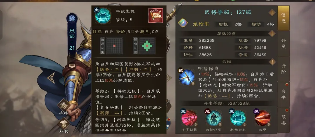 冷却3回合,释放后为自身及周围两圈队友添加【防备·二】和【严明·二】双buff,持续3回合。张郃额外获得15%生命上限护盾,大幅提升团队容错率。