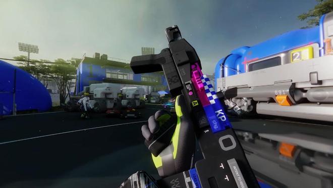 这种先锋美学不仅停留在菜单UI,还广泛应用于游戏场景。在真实光影和细腻物理材质环境中,产生数字信息“入侵”现实的感觉,营造出偏执、紧绷、混乱迷幻的氛围,与紧张战斗相得益彰。