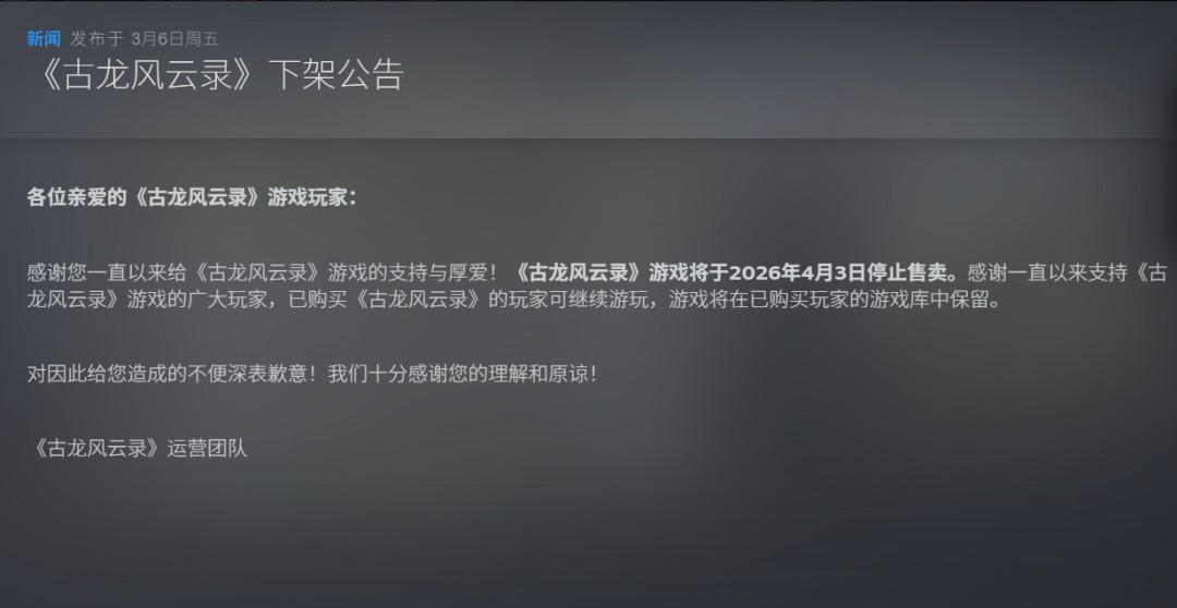 古龙风云录4月3日下架停售相关事宜