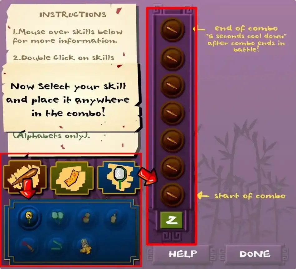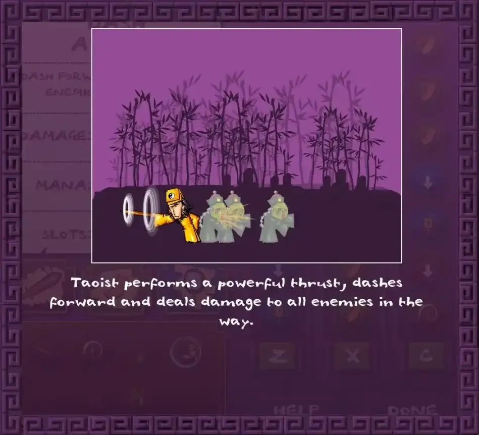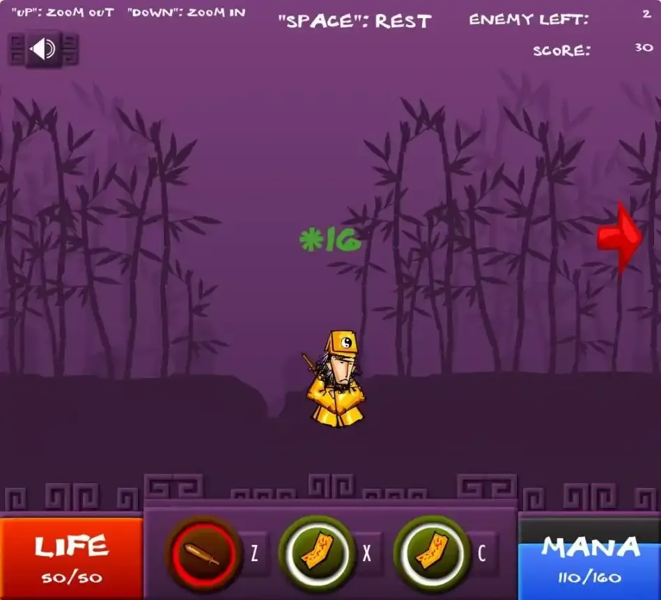 游戏的操作也十分简单,↑↓控制视野缩放,←→进行移动,空格可以打坐回魔(恢复血量和法力值),Z进行攻击(后续会解锁X和C的技能编辑条),有趣的是攻击方式是可以自己编辑的,调整一套属于自己的攻击套路可以做到事半功倍哦!