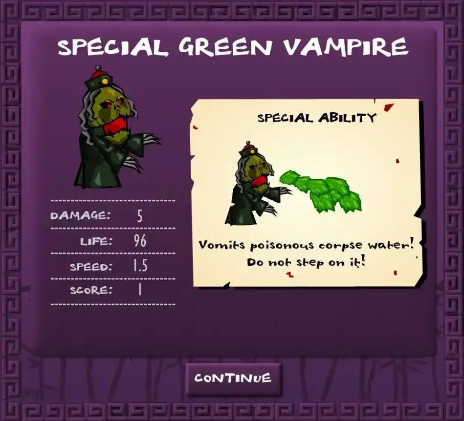 演示突刺第三关出现了一个特殊僵尸(口水婆),一看样子就是生前享尽荣华富贵,这关就要小心她的口水了,因为碰到之后会受到持续伤害,并且被定格住,这关也是解锁了新技能突刺,虽然伤害偏高,突刺距离远,但是很有可能会冲进僵尸堆被围殴死,如果要带尽量多带几个好用来位移。