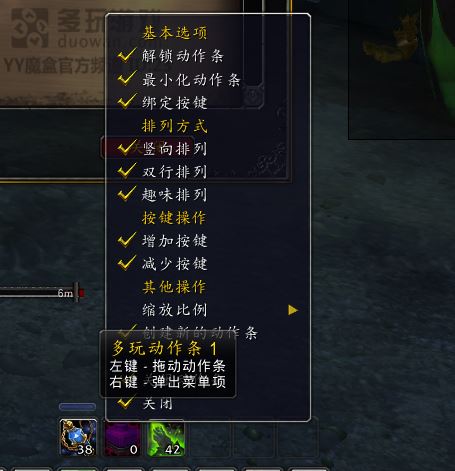 多玩动作条 键位不够用时或者有一些常用的加状态的物品可以放上面,此动作条左上角右键有菜单,可自行选择如何下载安装