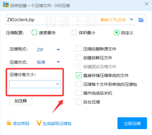 4.在压缩分卷大小中可以自己输入分卷大小,也可以选择预设设置;