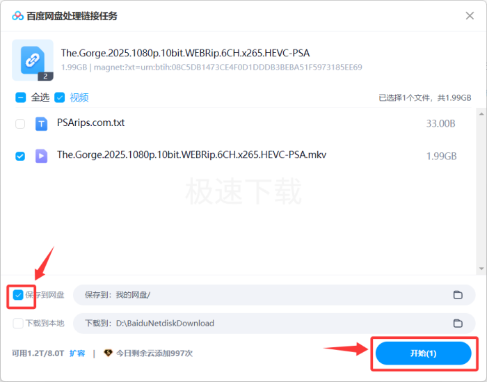 5.勾选保存到云盘,下载到本地暂不勾选,完成后点击【开始】;
