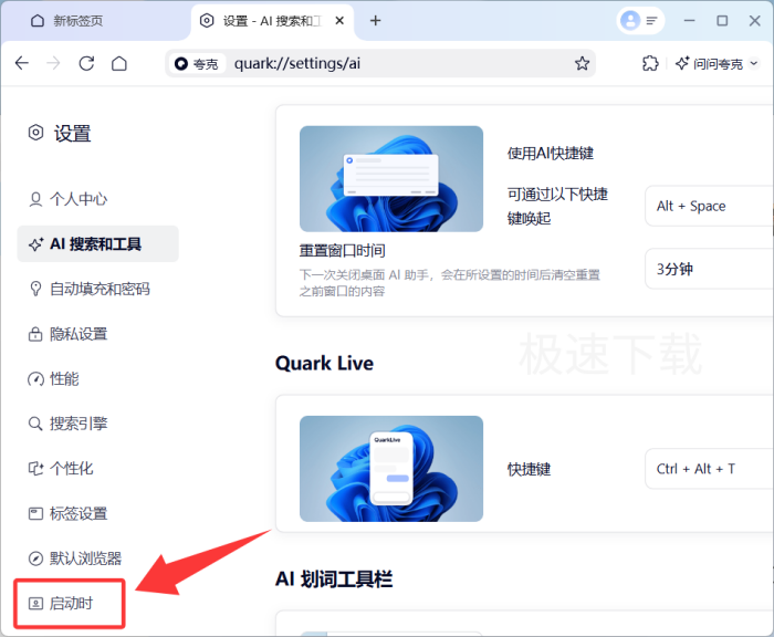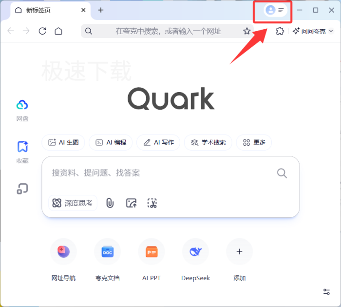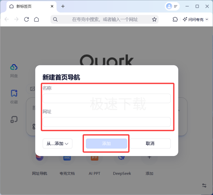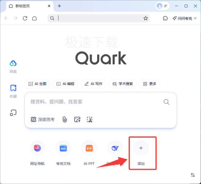 极速下载软件达人测试后发现,打开新标签页的页面无法进行更改,用户只能进入夸克预设的标签页面,不过用户可以在下方点击+号,添加需要的网页,来自定义导航界面。
