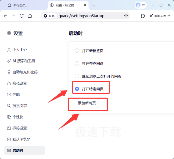 4.勾选【打开特定网页】,并点击【添加新网页】;