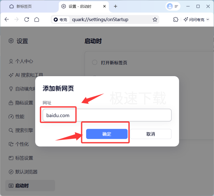5.在网址框内输入启动时要加载的网页地址,点击【确认】;