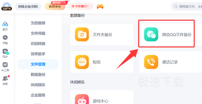 2.在数据备份一栏找到【微信QQ文件备份】;