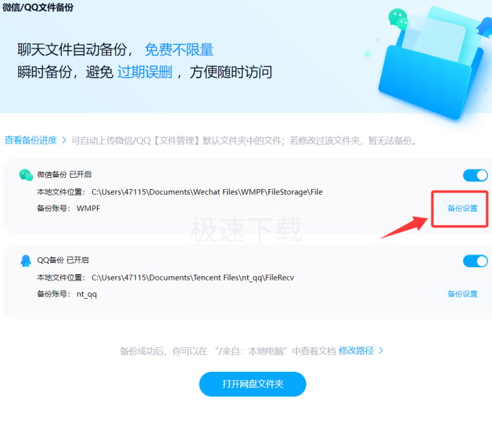 百度网盘设置备份微信和QQ文件后能否改动本地路径