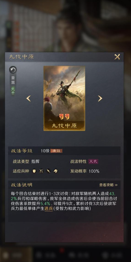 最优战法:大破街亭/摧坚/势如破竹+威名/妖武,AB配。不要带胜敌锐不可当一类的,张辽自带战法无伤害,收益极低。